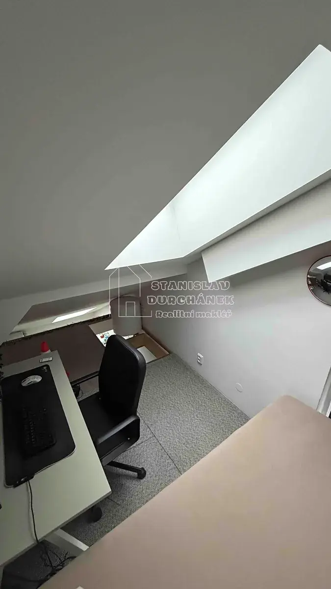 Disponuje patrem pro spaní (šířka postele 100 cm) s pracovním koutem.
