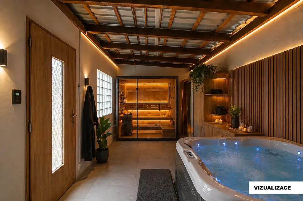 Vedlejší samostatná stavba o výměře 20 m² včetně elektro přípravy měla být příjemnou saunou a osvěžujícím whirlpoolem.