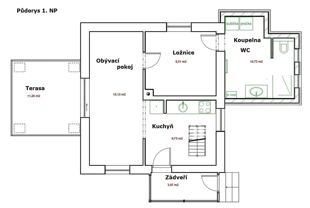 Projekt přístavku koupelny počítá s vchodem z ložnice v přízemí. Zde má být umístěn plynový kotel, sprchový kout, WC, místo pro pračku se sušičkou, sušicí žebříček a umyvadlo. Pro všechna média jsou připraveny přívody i armatury.