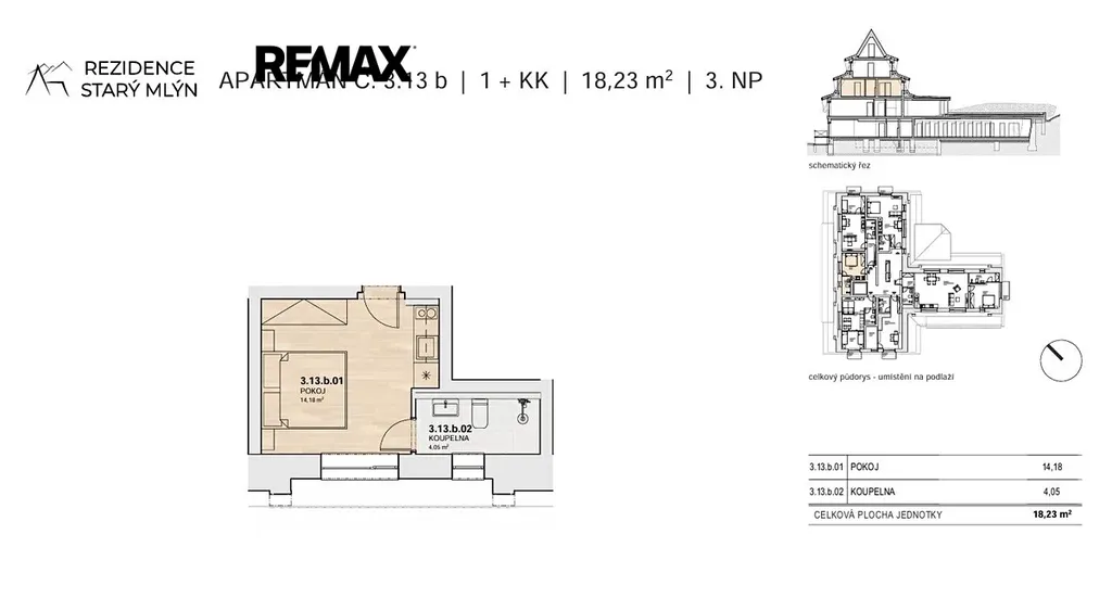 Prezentovaný apartmán č. 13b o dispozici 1+KK se nachází ve 3NP a disponuje podlahovou plochou 18,2 m². K apartmánu dále náleží privátní uzamykatelná kolárna + lyžárna (2,5m²), možnost využívání společného wellness. Cena za apartmán je uváděna včetně parkovacího stání (v hodnotě 400tis Kč) a DPH s možností odpočtu ve výši 21%. Aktuálně nabízíme voucher na kuchyňskou linku v hodnotě 100 tis Kč. Stavba byla již zahájena a plánované dokončení je do konce roku 2026.