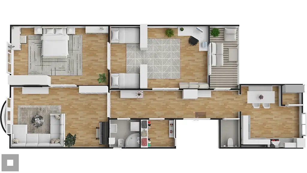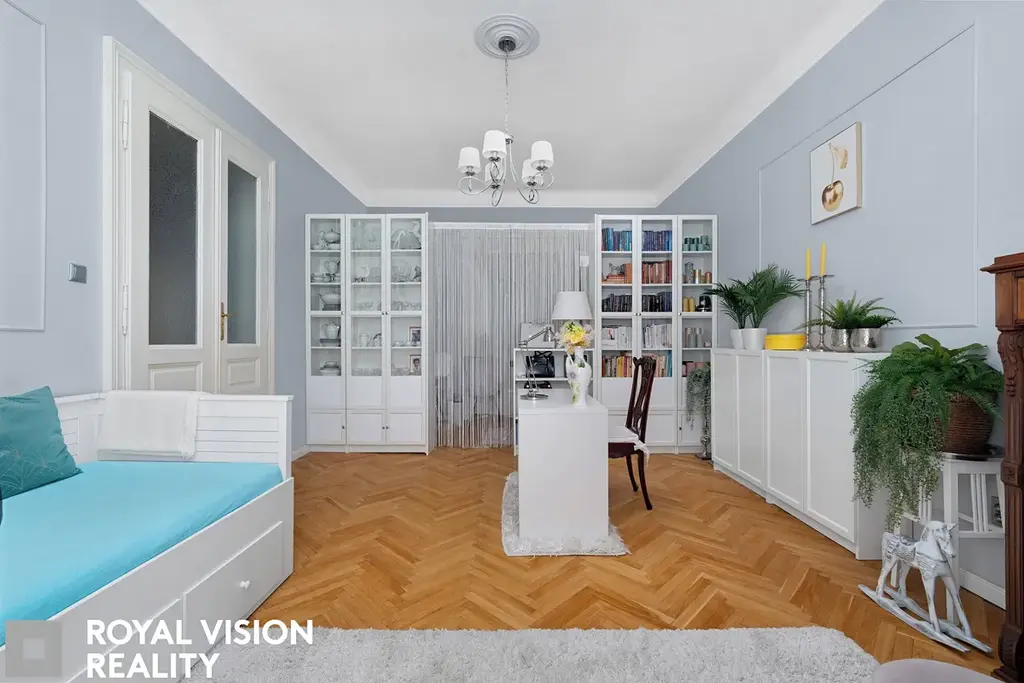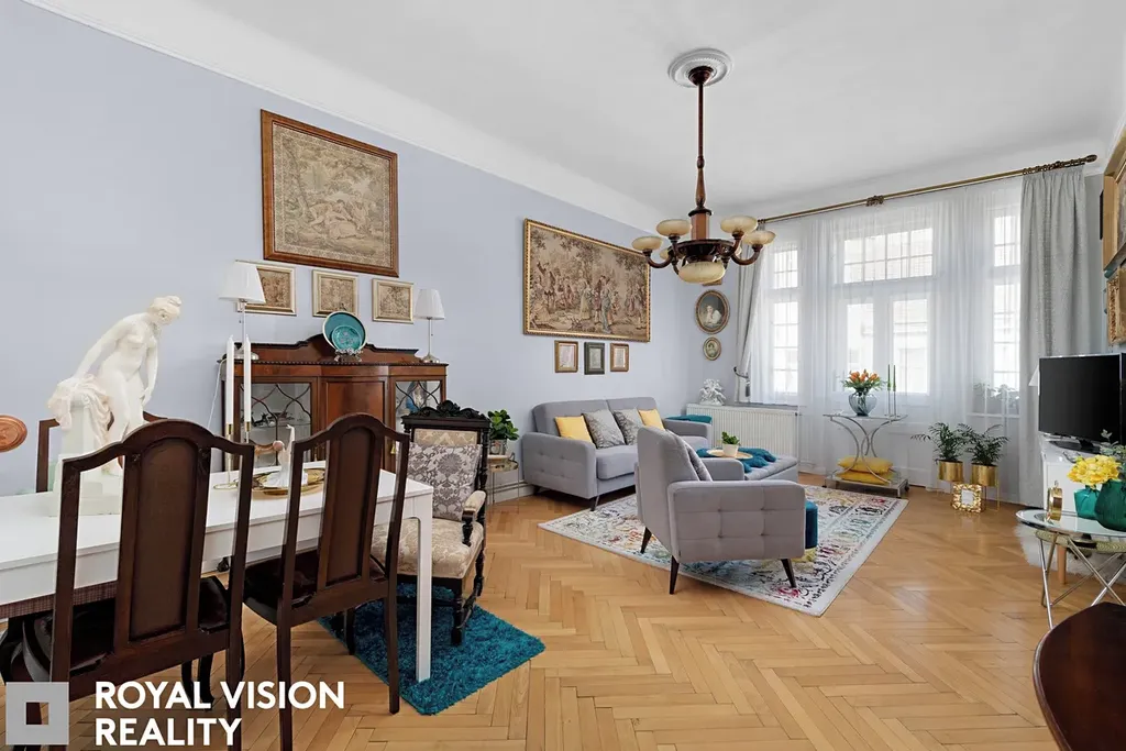 Celý byt působí velmi vkusně a udržovaně, zachovává si historické prvky jako dřevěné zárubně a dveře, které dodávají interiéru jedinečný charakter. Díky své velikosti a dispozici je ideální pro větší rodinu.