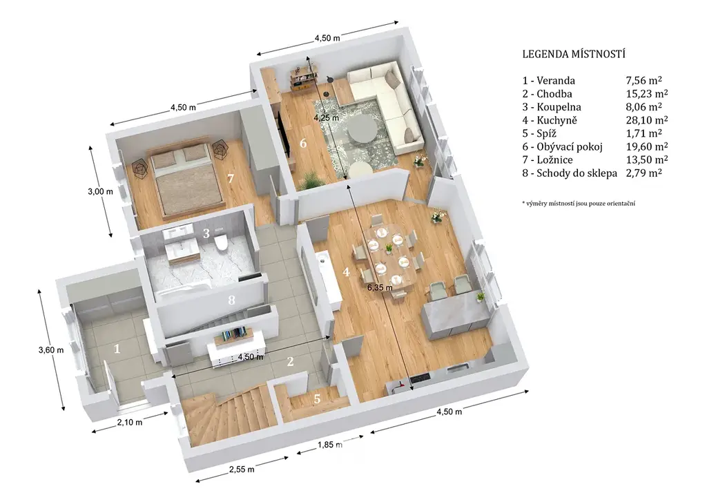 1.NP: veranda - 7,56 m², chodba - 15,23 m², koupelna - 8,06 m², kuchyně - 28,1 m², spíž - 1,71 m², obývací pokoj - 19,6 m², ložnice - 13,5 m², schodiště - 2,79 m². Celková výměra - 96,55 m².