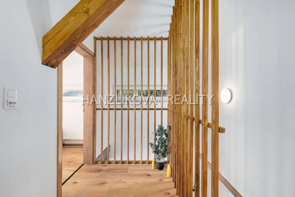 V podkroví jsou čtyři samostatné ložnice a druhá koupelna s WC.