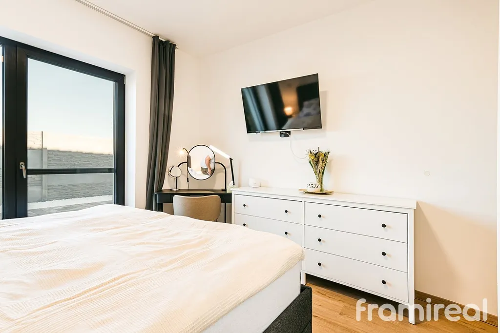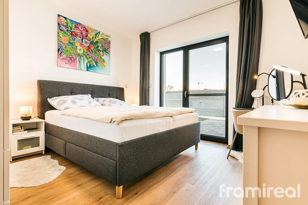 Obývací část s kuchyňským koutem a ostrůvkem tvoří přirozené centrum domu. Ložnice je orientovaná do zahrady a díky francouzskému oknu příjemně prosvětlená. Samostatná, plně vybavená šatna uvolňuje obytné místnosti od úložných prvků. Koupelna nabízí vanu i sprchový kout, k dispozici je také druhá samostatná toaleta.