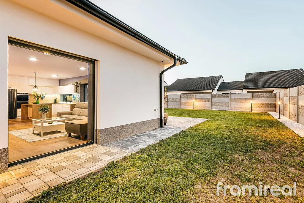 Na pozemku je hotová terasa s venkovním osvětlením, ideální pro večerní posezení. Zahrada je připravena k dokončení podle vlastních představ. Parkování je již vyřešeno – na pozemku je dostatek místa pro více vozů.