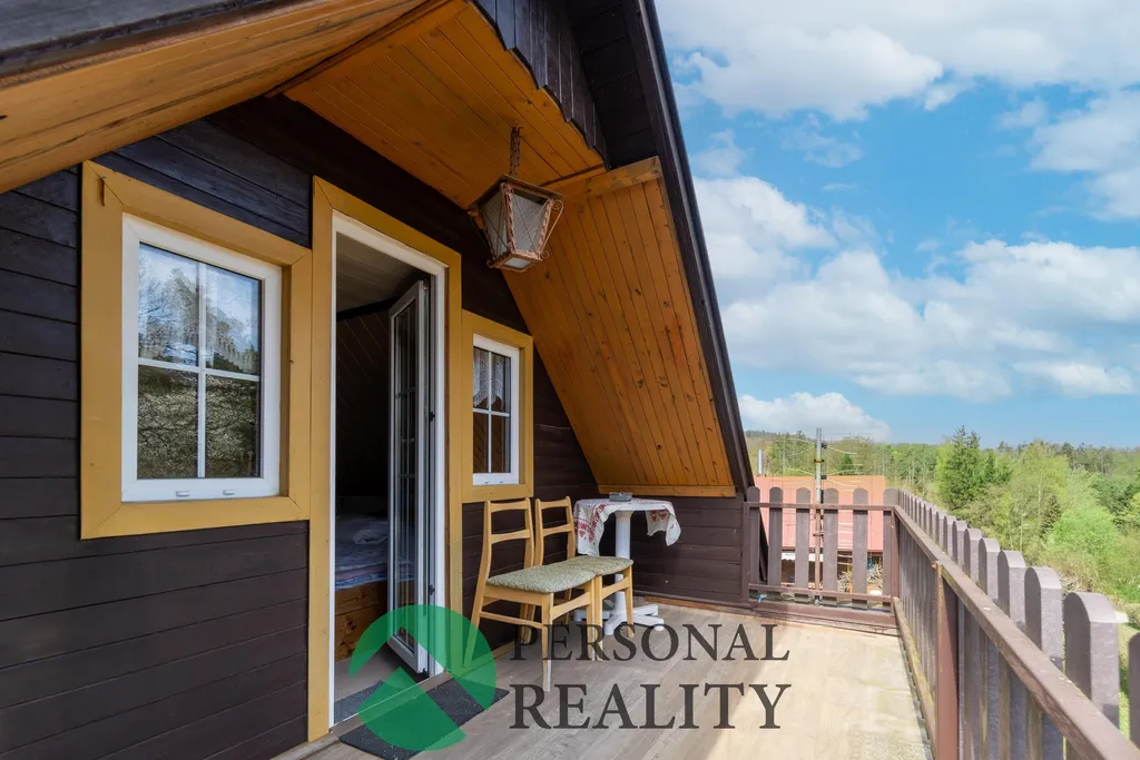 Chata je kompletně podsklepená, což poskytuje dostatek úložného prostoru i praktické technické zázemí. V přízemí vás přivítá vstupní chodba se schodištěm, ze které je přístup do samostatného WC a koupelny s vanou a přípojkou na pračku. Dominantou přízemí je útulný obývací pokoj propojený se světlou kuchyní a jídelním koutem. V patře najdete příjemný odpočinkový prostor nad schodištěm s gaučem, vhodný jako čtecí koutek či místo pro hosty, a samostatnou ložnici se vstupem na prostorný balkon s výhledem do zeleně. Chata se prodává včetně většiny nábytku a ostatního zařízení.