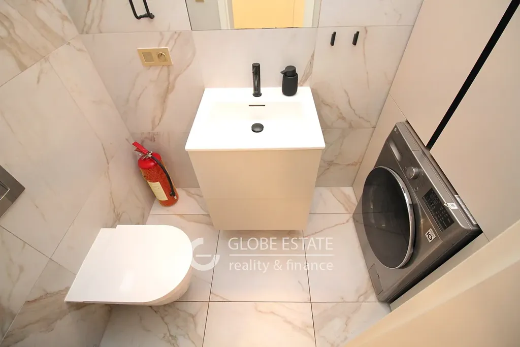 Interiér je navržen s ohledem na maximální efektivitu a komfort. Naleznete zde samostatnou kancelář pro soustředěnou práci, prostorný open space, který podporuje týmovou spolupráci, plně vybavenou koupelnu s toaletou, samostatnou toaletu pro hosty s vestavěnou skříní a pračkou, praktický kuchyňský kout a vestavěnou skříň na chodbě pro dostatek úložného prostoru.