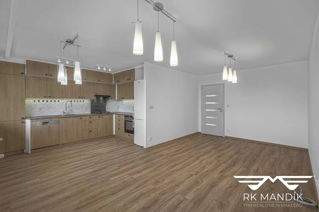 Dispozici tvoří prostorný obývací pokoj s plně vybaveným kuchyňským koutem o výměře 28,91 m² orientovaný na jižní stranu, odkud je přímý vstup na zasklenou lodžii o ploše 6,96 m². Kuchyňská linka je osazena plynovou varnou deskou, digestoří s odvodem, elektrickou troubou, myčkou nádobí a kombinovanou lednicí s mrazákem.