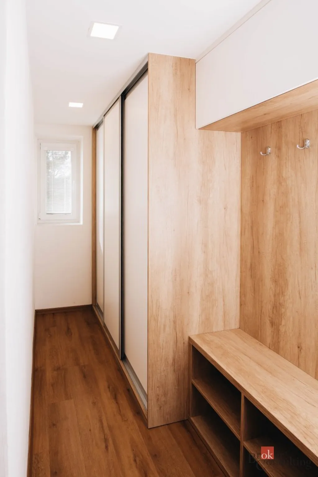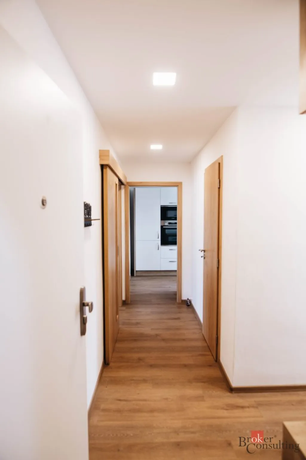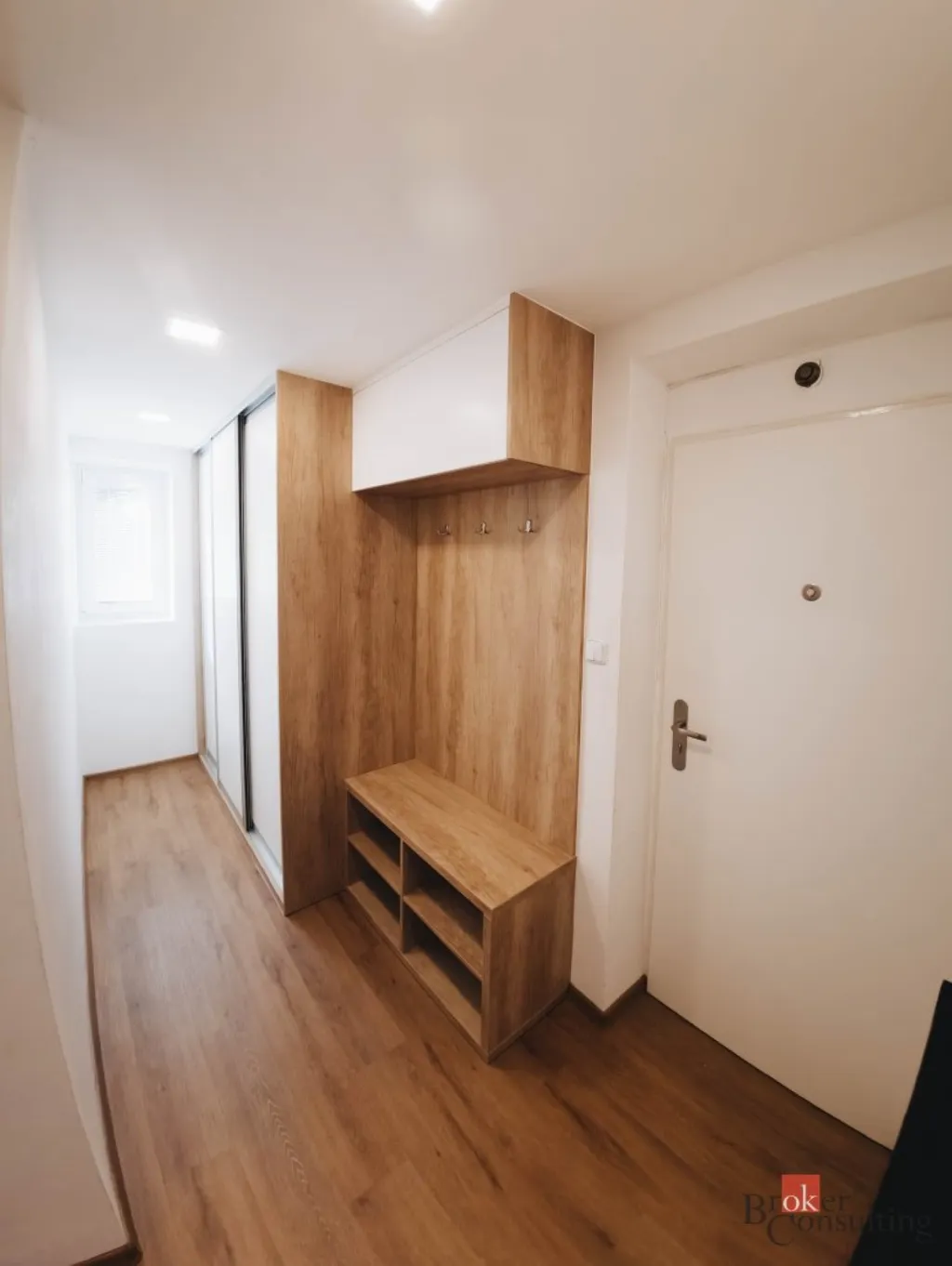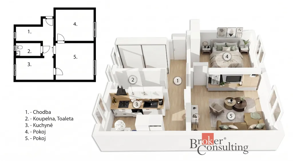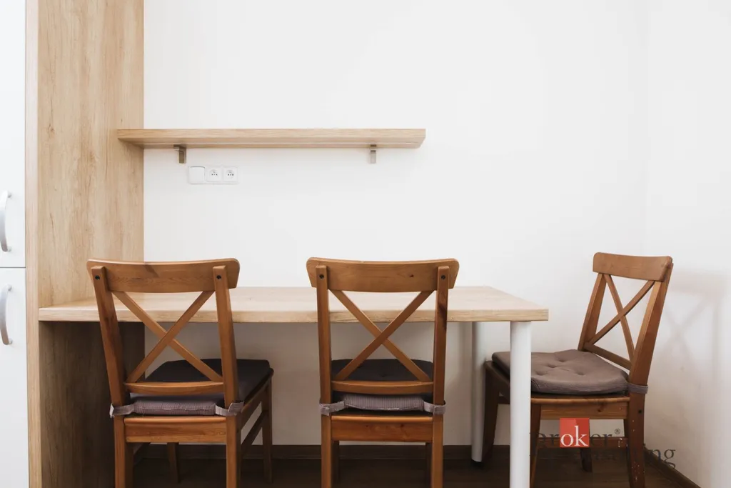 Dispozice bytu zahrnuje ložnici, obývací pokoj, kuchyň s jídelním koutem, koupelnu s WC a samostatnou šatnu. Velkou výhodou jsou vestavěné skříně na míru, které se nachází v bytě a poskytují dostatek úložného místa bez narušení prostoru. Byt je možné případně upravit na dispozici 3+kk, takže je vhodný jak pro pár, tak pro rodinu.