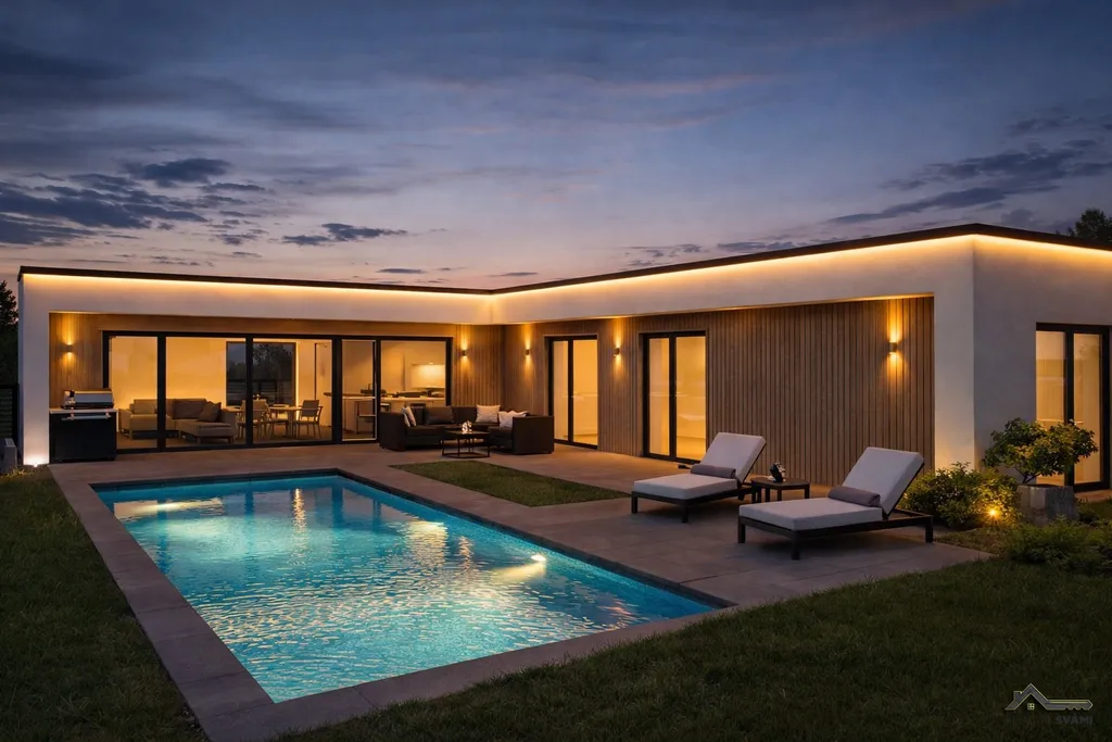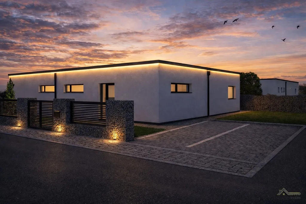 Dům ve fázi výstavby, kdy je hotová střecha, fasáda, příprava pro venkovní žaluzie a mnoho dalšího, ale i tak se zde nabízí možnost ovlivnit použité materiály, či změnit barevnost použitých materiálů, nebo rozložení kuchyňské linky. Nelze zasahovat do rozložení domu. V domě je dále použito vodní podlahové topení s tepelným čerpadlem, klimatizace v každém pokoji. Stavba je napojena na elektřinu, vodu a kanalizace bude řešena pomocí ČOV. Obec má v plánu rozšíření kanalizace, což bude možné do budoucna použít pro napojení domu.