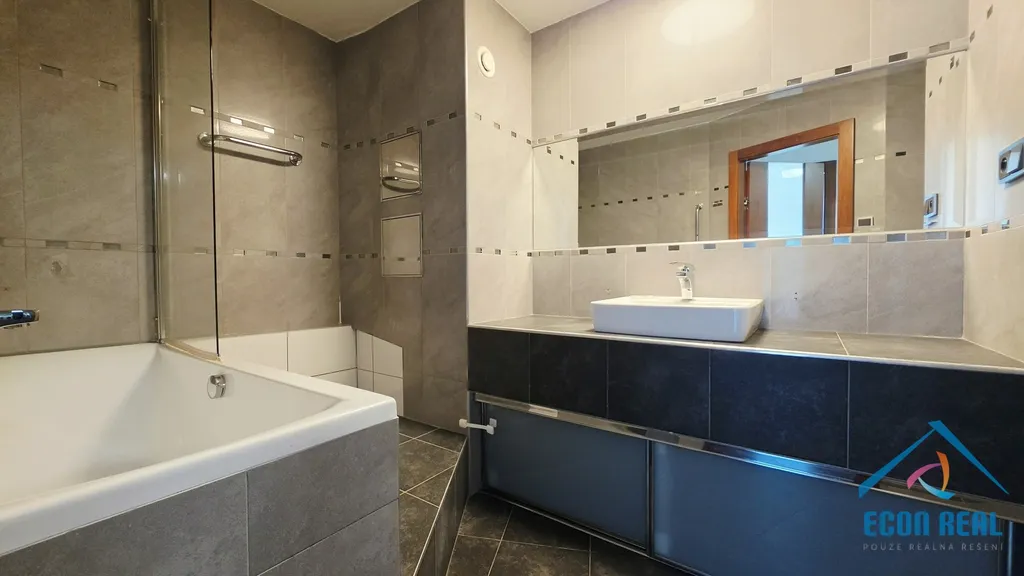 Ve zvětšené koupelně je mimo vany i umyvadlo s úložnými prostory na míru, velké zrcadlo a přípojka na pračku/sušičku. Toaleta je samostatně.
