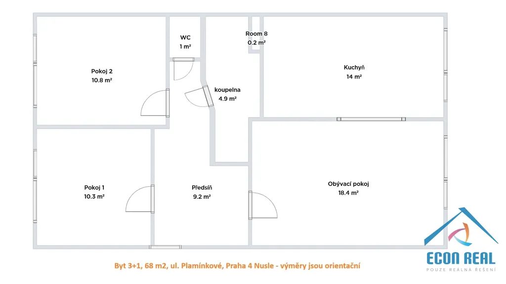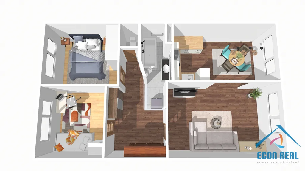 Byt 3+1 je praktické dispozice s centrální předsíní, s neprůchozími ložnicemi a s velkou kuchyní, která je oddělena od obývacího pokoje příčkou s rozšířeným vstupem a nabízí příjemné a kvalitní bydlení s dostatkem úložných prostor.