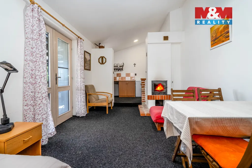 Interiér nabízí vstupní předsíň, ze které se dostanete do kuchyně propojené s obývacím pokojem, jehož dominantou je krb vytvářející útulnou atmosféru. Z obývací části je přímý vstup na prostornou zastřešenou terasu s jedinečným kouzlem a nádherným panoramatickým výhledem na okolní kopce. Dále zde najdete dvě samostatné ložnice a koupelnu se sprchovým koutem a toaletou.