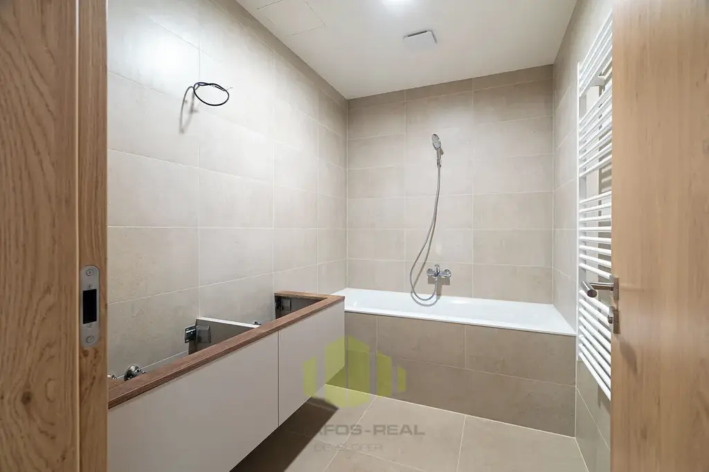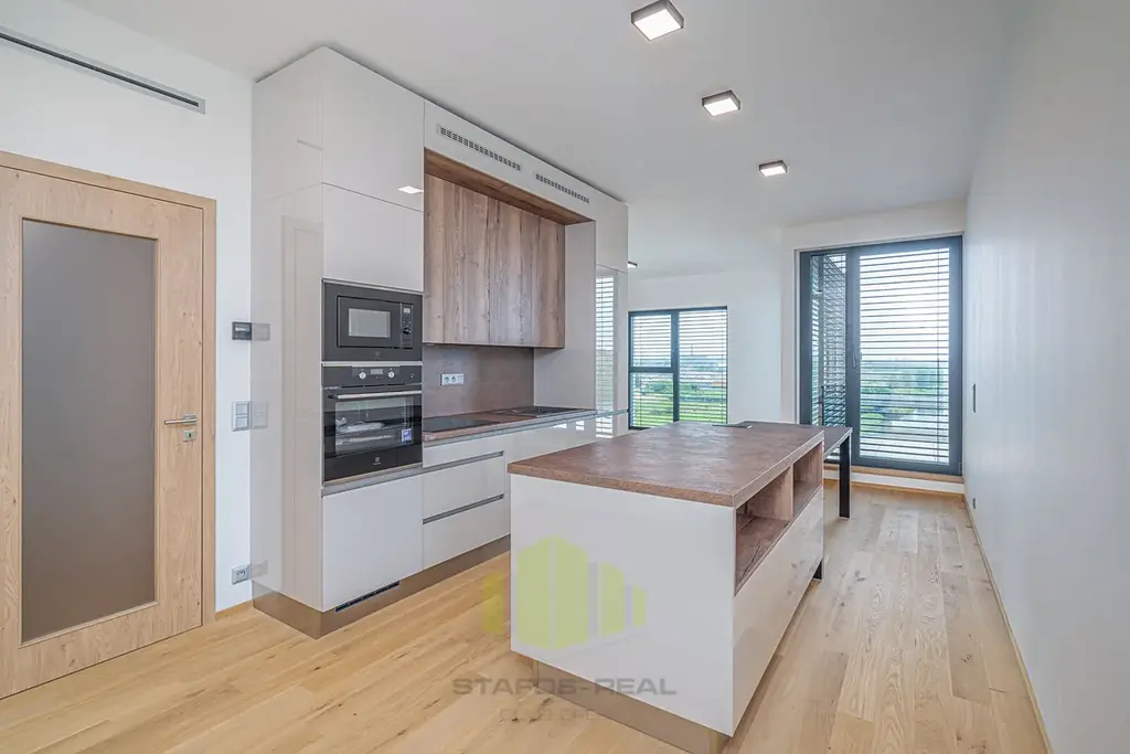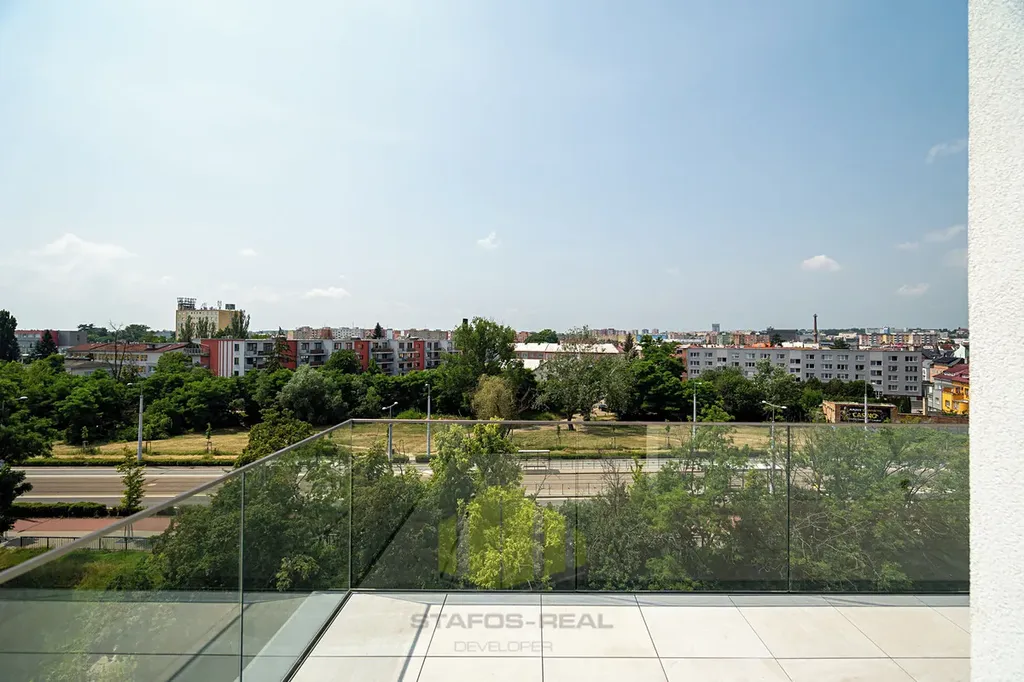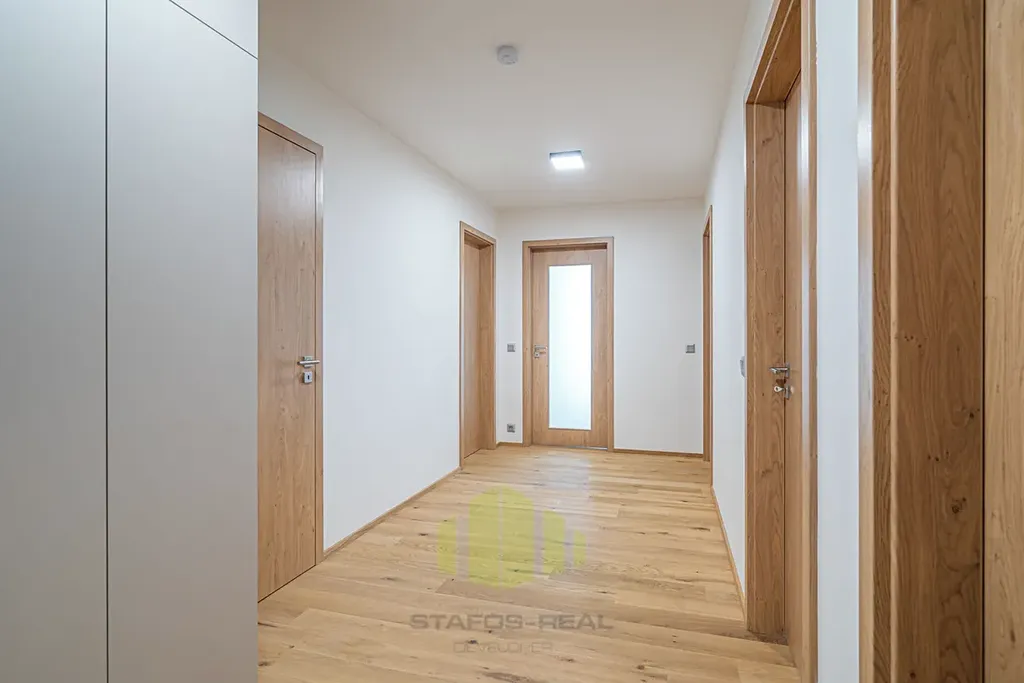Byt, orientovaný na tři světové strany (Jih, Západ, Sever) nabízí úžasné panoramatické výhledy, a to hned ze dvou venkovních částí bytu - terasy o ploše 18m2 přístupné z obývacího pokoje, tak i lodžie o ploše 5,7m2 s posuvnými paravány přístupné z jedné z ložnic. Při vstupu do bytu je v zádveří umístěn botník s věšáky a šatní skříní, po pravé straně předsíně je k dispozici toaleta s malým umyvadlem, ložnice, dále ložnice s vestavěnou skříní a vstupem na lodžii. Z levé strany je pak umístěna technická místnost s rekuperační jednotkou, servisní skříňkou od podlahového topení a přípravou na pračku se sušičkou, dále koupelna s dvojumyvadlem, vanou a otopným žebříkem. Na konci chodby pak vcházíme do obývacího pokoje s kuchyňskou částí do tvaru L se vstupem na terasu. Obývací pokoj je průchozí do manželské ložnice s vestavěnou skříní a privátní koupelnou se sprchovým koutem, umyvadlem a toaletou.