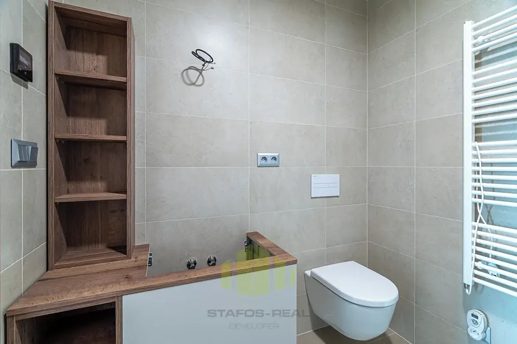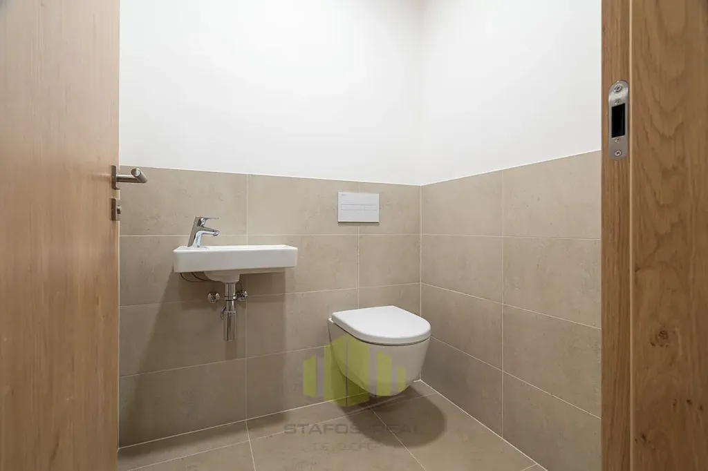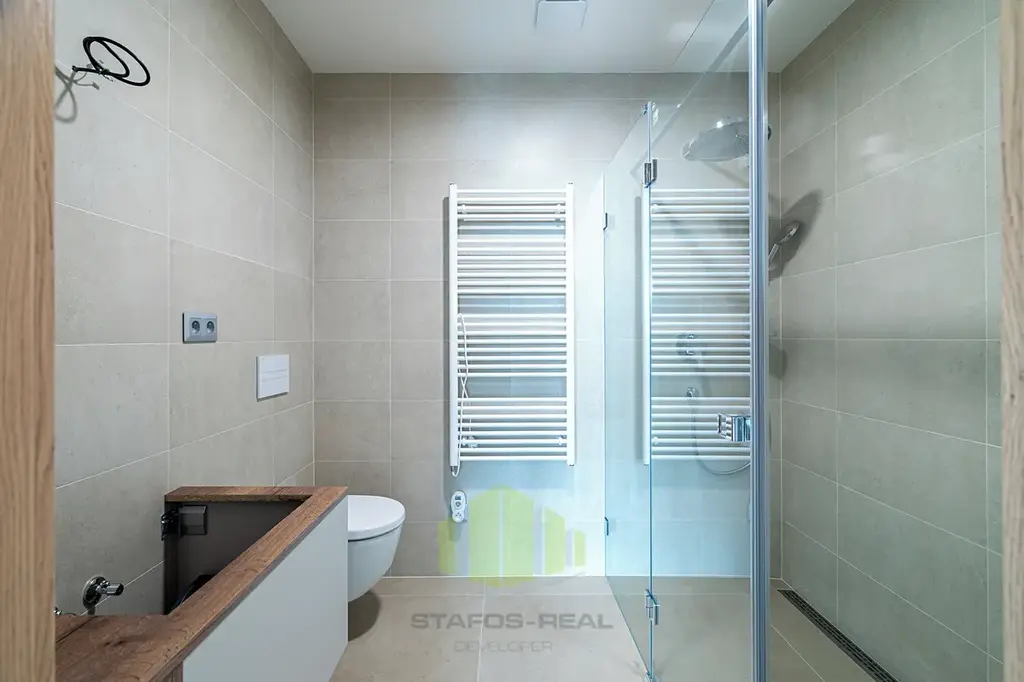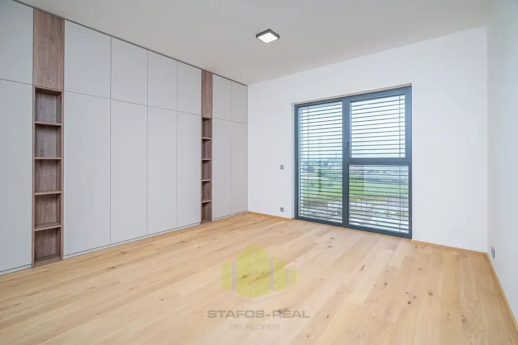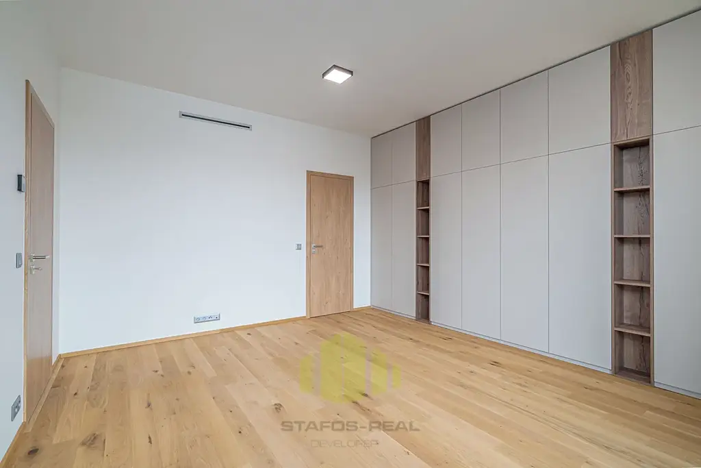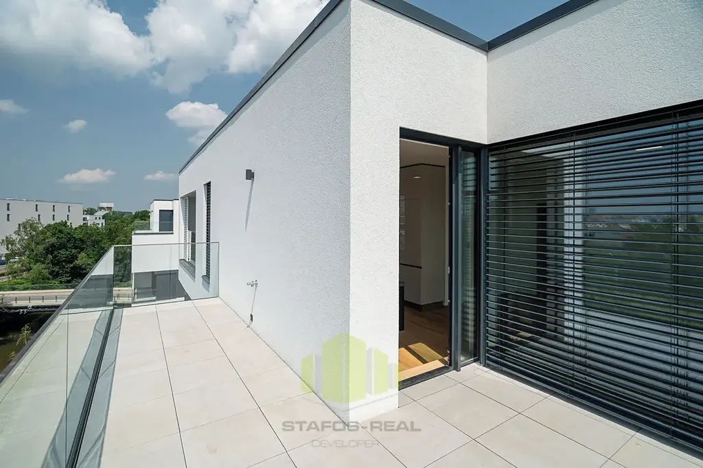 A jaké moderní technologie na Vás čekají? V prvé řadě je to úsporné stropní chlazení REHAU, rekuperace vzduchu a teplovodní podlahové topení v kombinaci s geotermálními vrty s tepelnými čerpadly, díky čemuž je bydlení nejen opravdu nízkonákladové a komfortní po celý rok, ale také antialergenní! Dále stojí za zmínku hliníková okna s trojskly, třívrstvé dřevěné podlahy, sádrové omítky, příprava na jacuzzi na terase, značková sanita, ale také i například kočárkárna/kolárna a místnost pro mytí kol a pejsků v přízemí! Velkým benefitem jsou již zmíněné dvě koupelny, jedna společná a druhá privátní manželská! Samozřejmostí je bezbariérový přístup do domu, vysokorychlostní stabilní internet optickým kabelem a moderní výtah.