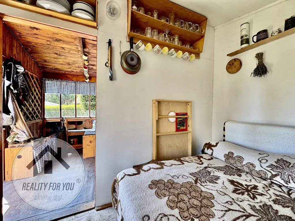 Na pozemku je pergola s posezením s příjemným výhledem a hlavně soukromím. Na zahrádce najdeme skleník, udírnu, ovocné stromy: jabloň, třešeň a švestku, a dále rybíz, angrešt nebo vinnou révu.