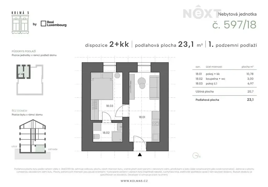 Tato konkrétní jednotka č.18 o dispozici 2kk a podlahové ploše 23,1 m2 se nachází v 1 podzemním podlaží s výhledem do ulice. Přesné rozložení si můžete prohlédnout na přiloženém půdorysu.