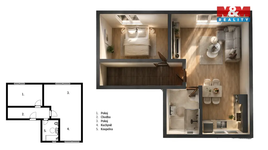 Nabízíme k prodeji moderní byt 2+kk o užitné ploše 43 m², který vznikl v rámci kompletní rekonstrukce rodinného domu v obci Kožušany-Tážaly. Při rekonstrukci byl kladen důraz na kvalitu použitých materiálů i současné standardy bydlení. Byt se nachází v 1. patře a nabízí promyšlenou dispozici: obývací pokoj s kuchyňským koutem a jídelnou, samostatnou ložnici a koupelnu se sprchovým koutem. Samozřejmostí je podlahové vytápění, vinylové podlahy a klimatizace. Výhodou je půdní prostor s přivedenými sítěmi, který nabízí potenciál pro rozšíření o další místnosti. Ve dvoře najedete prostor k vlastnímu odpočinku a relaxaci. Dále je zde i sklep a prostor pro kola a kočárky. Dům je vybaven kamerovým systémem a domovním zvonkem. Součástí bytu bude kuchyňská linka. Upozorňujeme, že přiložené fotografie jsou vizualizační. Dokončení bytu je plánováno nejpozději na srpen 2026, což umožňuje dostatek času k možnosti úprav dle vlastních představ. V případě zájmu o prohlídku nás neváhejte kontaktovat.