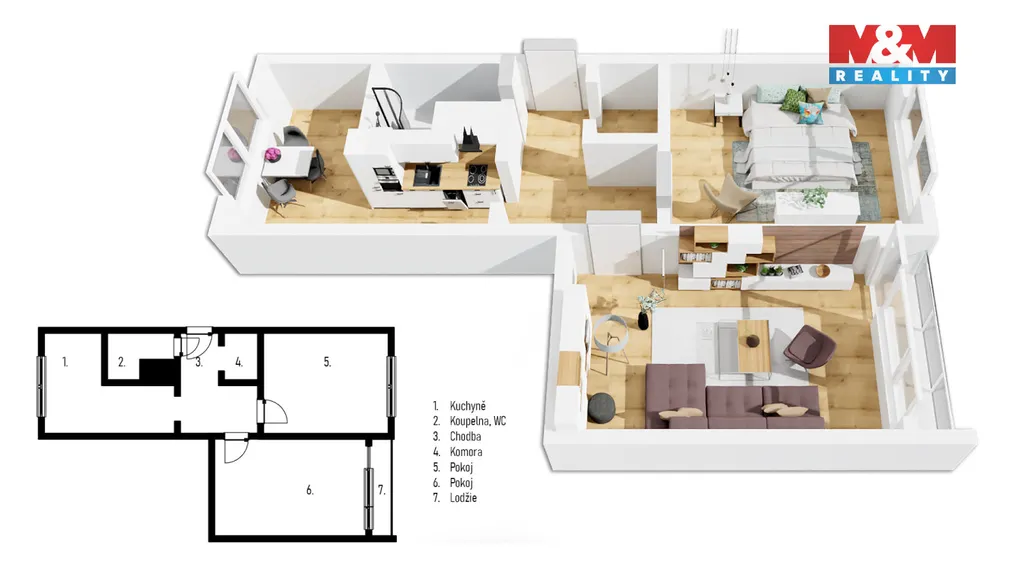 Každý slunečný den si naplno vychutnáte na jižně orientované lodžii, která doslova koupe interiér v hřejivém světle a dodává bydlení neopakovatelnou energii. Skvělá dispozice nabízí prostor, který dýchá. Zatímco šatna přímo v bytě hravě schová vše potřebné, komora v mezipatře a sklep zajistí, že váš domov zůstane dokonale uspořádaný.