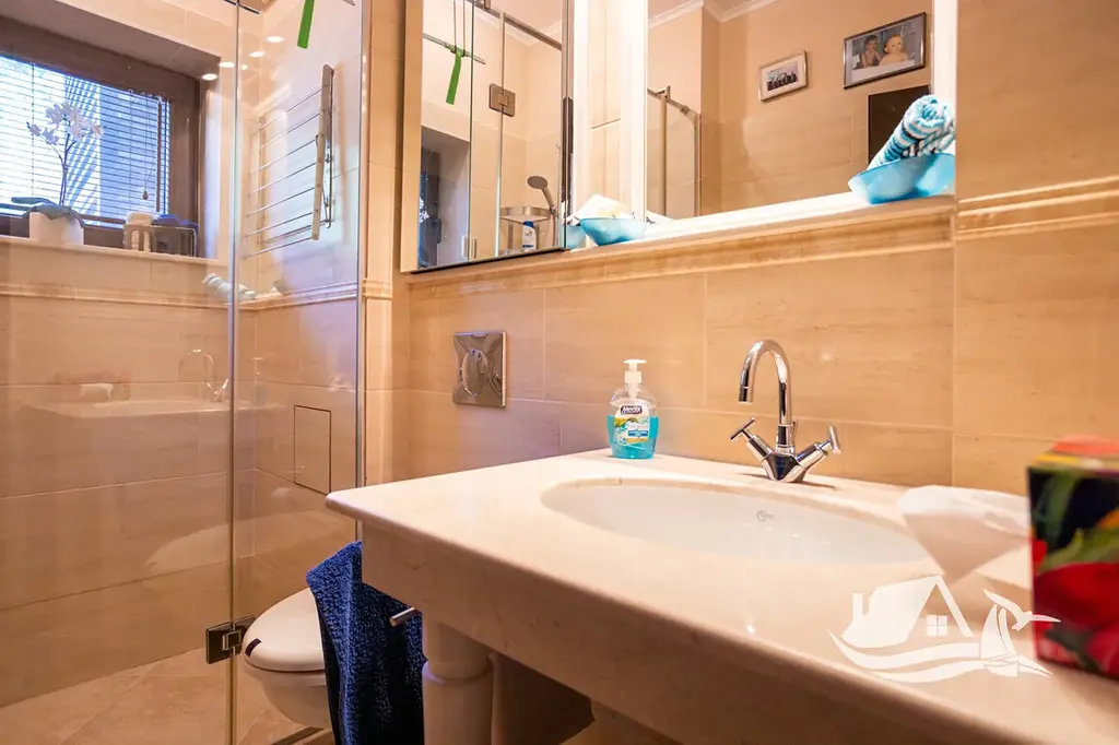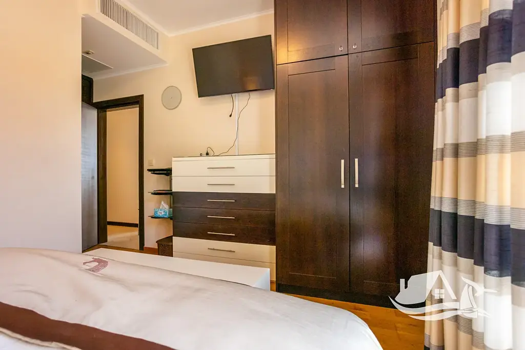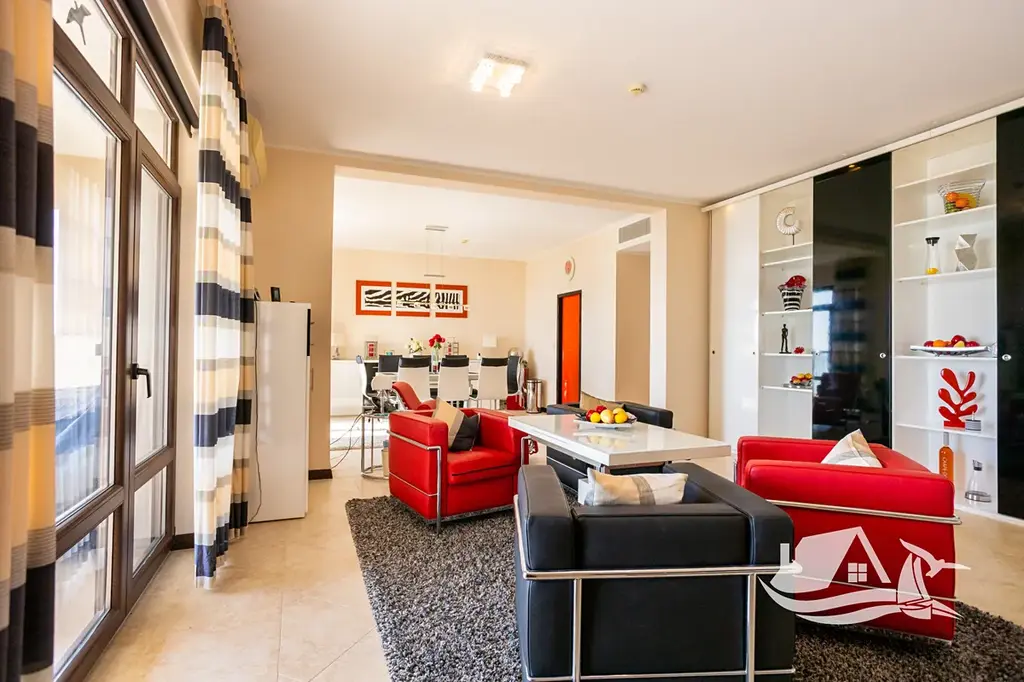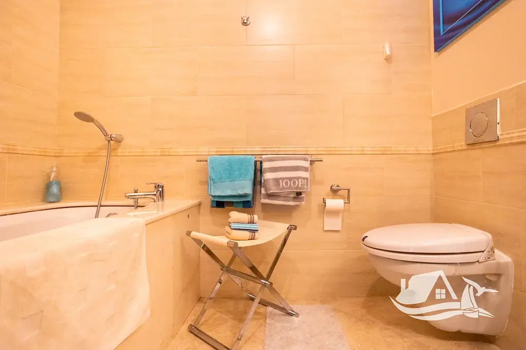 Apartmán o celkové ploše 214 - m² vznikl spojením dvou jednotek do jednoho harmonického celku. Výsledkem je prostor, který působí jako letní rezidence. Velkorysý obývací pokoj, samostatná kuchyně, tři ložnice a tři koupelny poskytují dostatek místa pro rodinu i hosty.