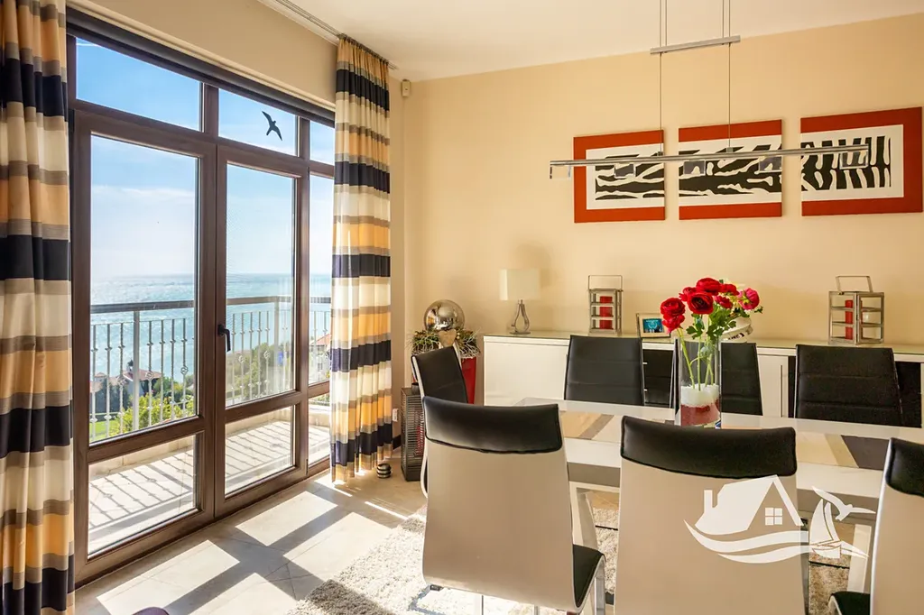 Dvě terasy otevírají výhled na moře a vytvářejí ideální místo pro klidná rána i dlouhé večery. Interiér je zařízený podle designového návrhu a nabízí komfort bez nutnosti dalších investic.