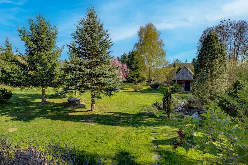 Zahrada je skoro rovinná, jsou zde vzrostlé okrasné keře a stromy, zahradní jezírko, kryté venkovní posezení a přístřešek na auto. Zahradní domek slouží k letnímu využití pro hosty nebo v zimě na uskladnění zahradního nábytku a nářadí.