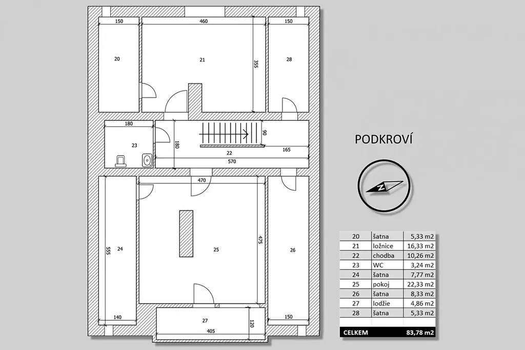 V podkroví (84 m2) jsou dvě místnosti, lodžie, čtyři praktické šatny a umývárna s wc.