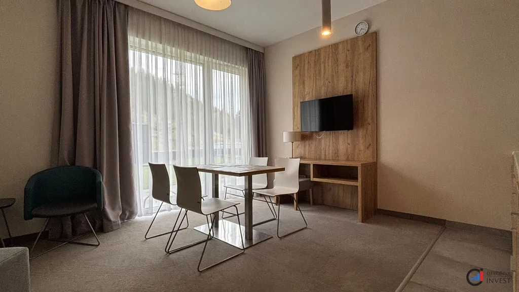 Dispozice zahrnuje ložnici, obývací pokoj s kuchyňským koutem a koupelnu. Z obývacího pokoje je vstup na terasu s navazujícím přístupem na zahradu. Apartmán se nachází v přízemí. Nábytek a vybavení jsou součástí ceny.
