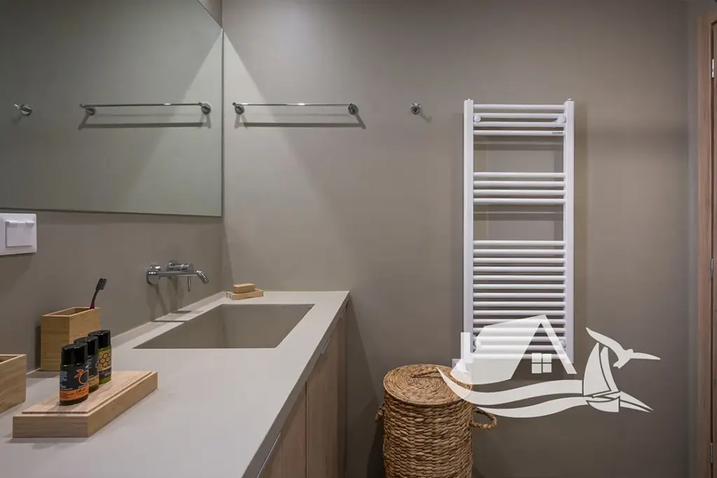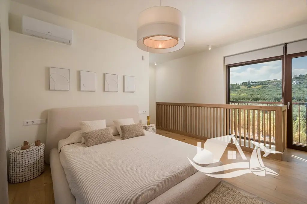 Do horního patra vede dřevěné schodiště, kde se nachází druhá dvoulůžková ložnice s vlastní koupelnou (ensuite), pracovním koutem a vestavěnými skříněmi. Okna na obou stranách zajišťují dostatek denního světla a krásné výhledy na moře i okolní krajinu.
