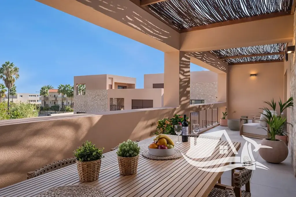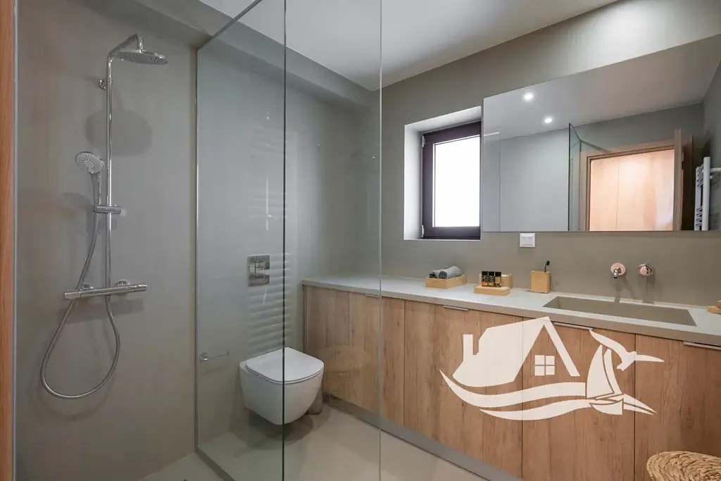 Apartmán se rozkládá ve dvou podlažích (1. a 2. patro) a nabízí otevřené výhledy na moře. Spodní úroveň tvoří světlý obývací prostor s kuchyní, který plynule navazuje na prostornou krytou verandu s dřevěnou pergolou – ideální místo pro stolování, relaxaci i posezení s výhledem na pláž. Dále se zde nachází koupelna a dvoulůžková ložnice s přímým vstupem na verandu.