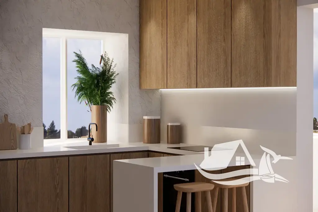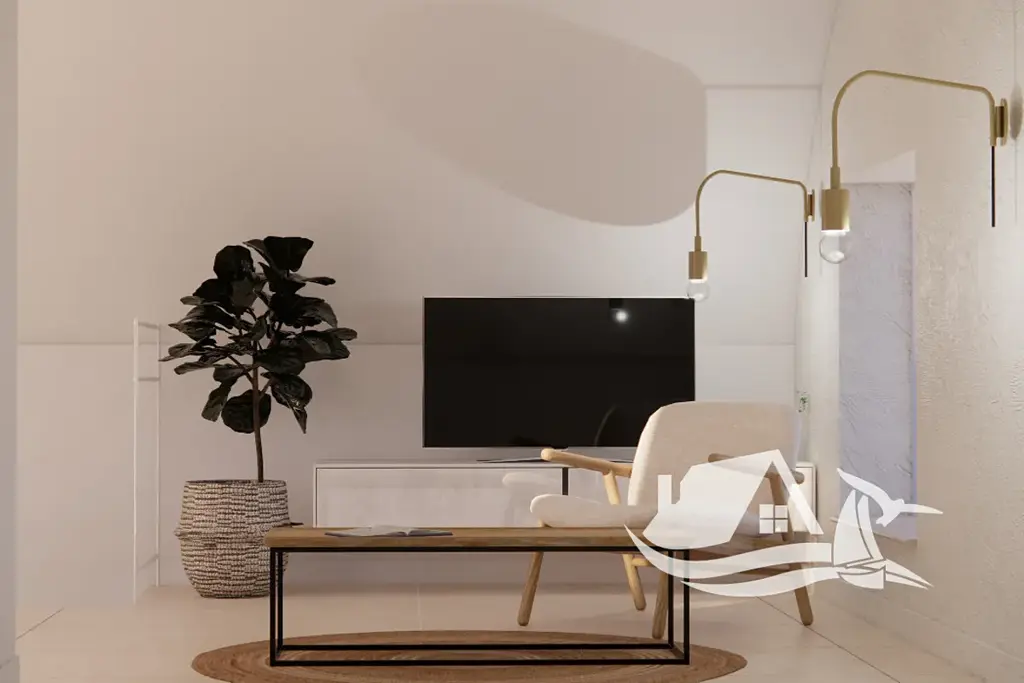 Přízemí nabízí přímý vstup na soukromé patio a zahradu, ideální pro ranní kávu či večerní relaxaci. První patro zahrnuje elegantní obývací prostor se vstupem na dvě soukromé terasy, plně vybavenou otevřenou kuchyni a koupelnu. Vzdušný mezanin, propojený plovoucím schodištěm, nabízí panoramatický výhled na moře a přístup na prostornou střešní terasu, ideální pro posezení při západu slunce.