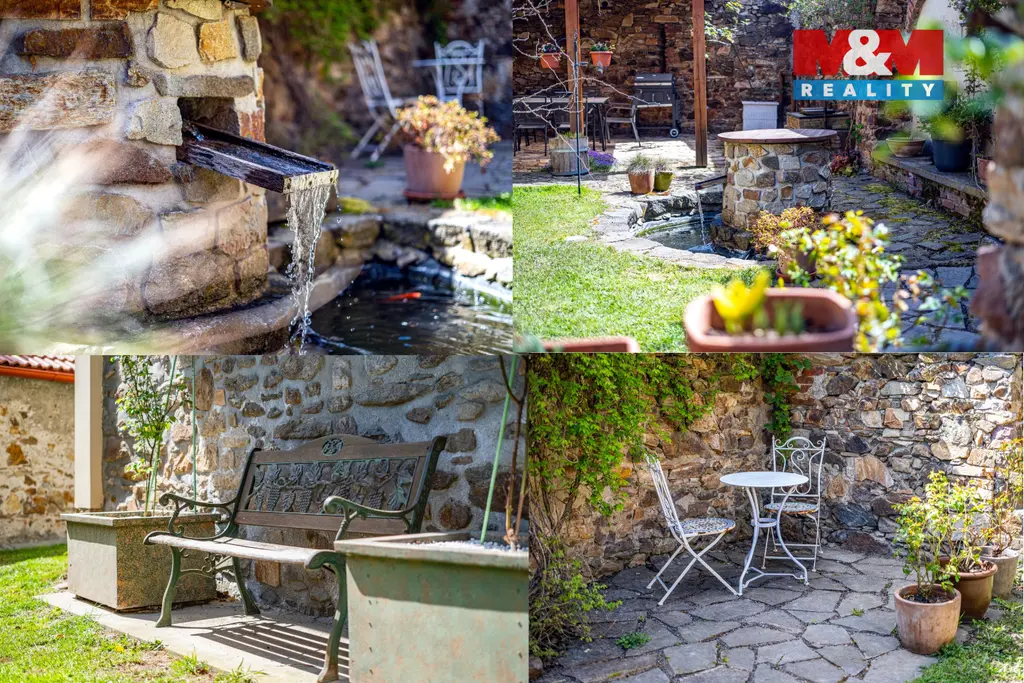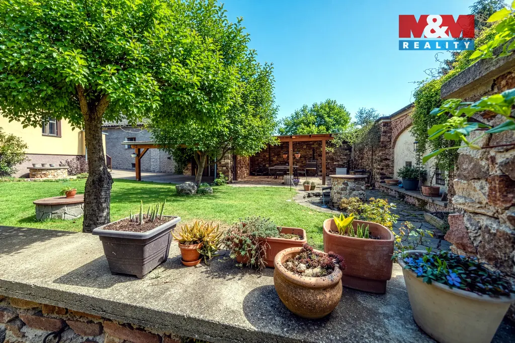 Za nenápadnou fasádou se otevírá klidný uzavřený dvůr se zahradou o velikosti 695 m², kde si můžete vychutnat ranní kávu na kryté terase, odpočinout si u jezírka a užívat si zeleň s automatickou závlahou, retenční nádrží i vlastní studnou.