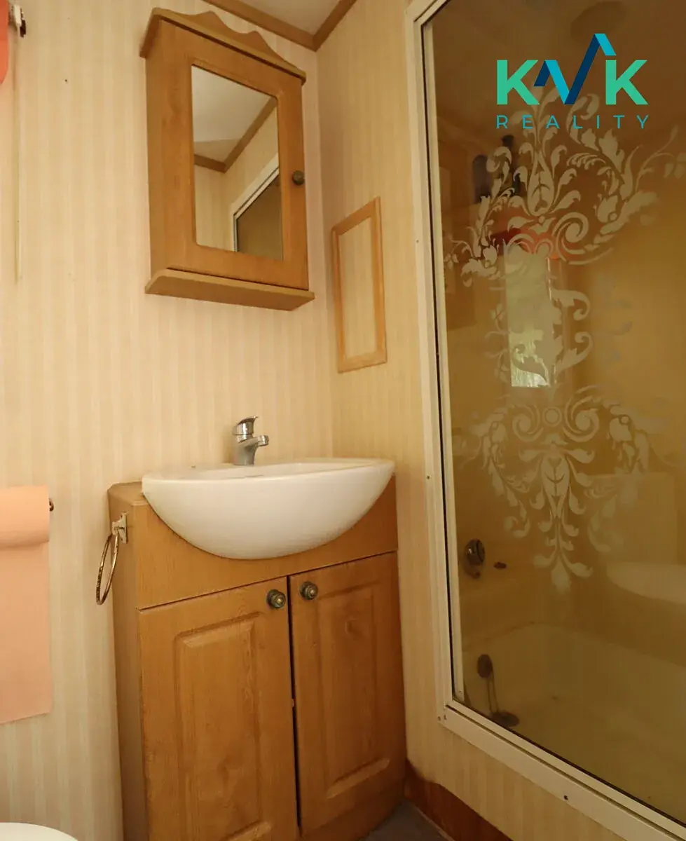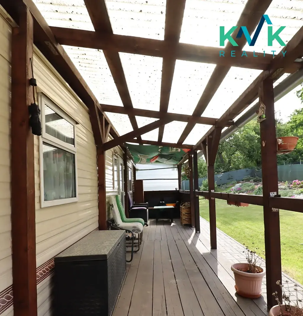 Součástí mobilheimu je zastřešená terasa, přičemž celá stavba má plechovou střechu. Podlaha je zateplená, což přispívá k lepšímu komfortu užívání.