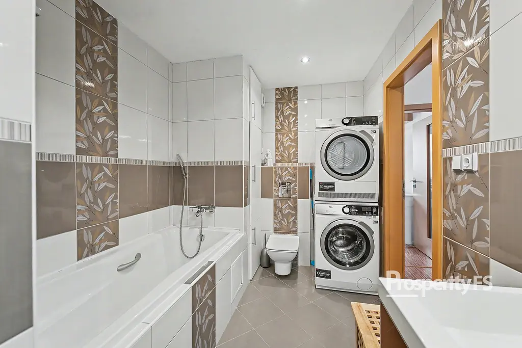 Koupelna je velmi prakticky řešená a nabízí jak vanu, tak i sprchový kout, což oceníte v každodenním provozu.