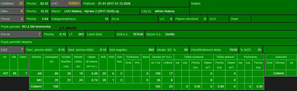 - p.č. 745 vedená jako lesní pozemek o celkové výměře 1 634 m2 (stáří lesa 91 let - zastoupení dřevin borovice, smrk),