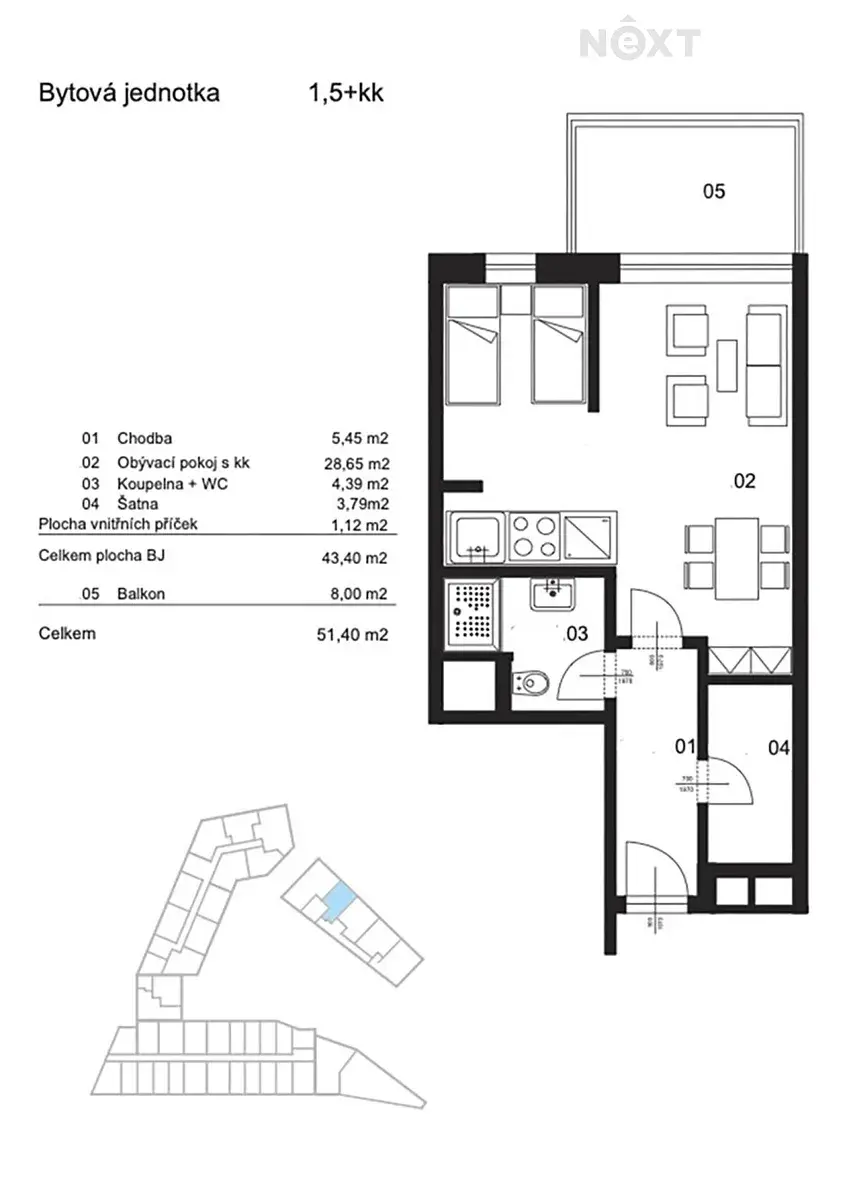 • dispozice bytu 1,5+KK, výměra 51,40 m2