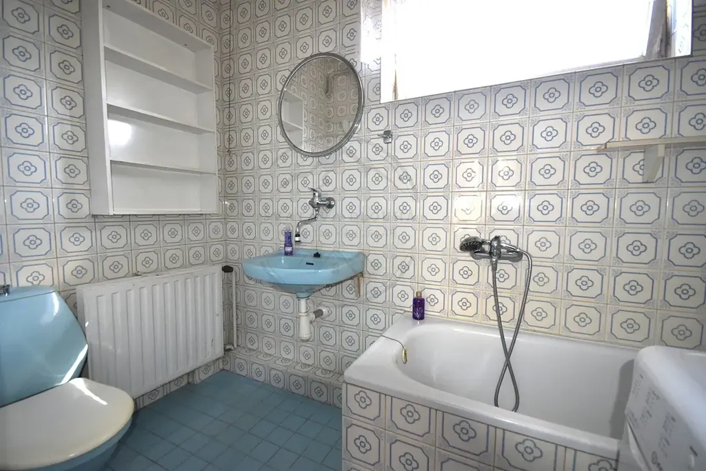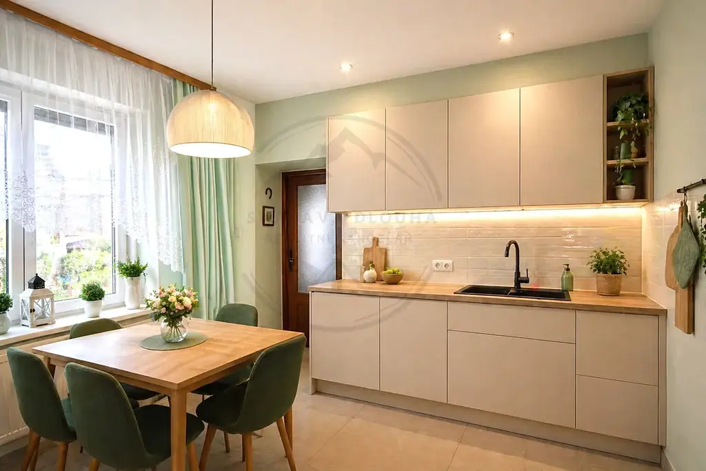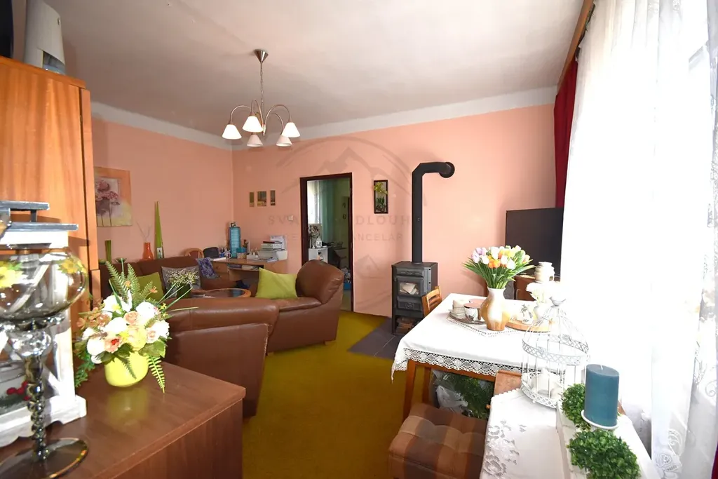 Dispozice bytu je velmi praktická – najdete zde prostornou kuchyň, velký obývací pokoj s kamny pro přitápění v chladnějších dnech, ložnici, dětský pokoj a koupelnu s vanou a WC.