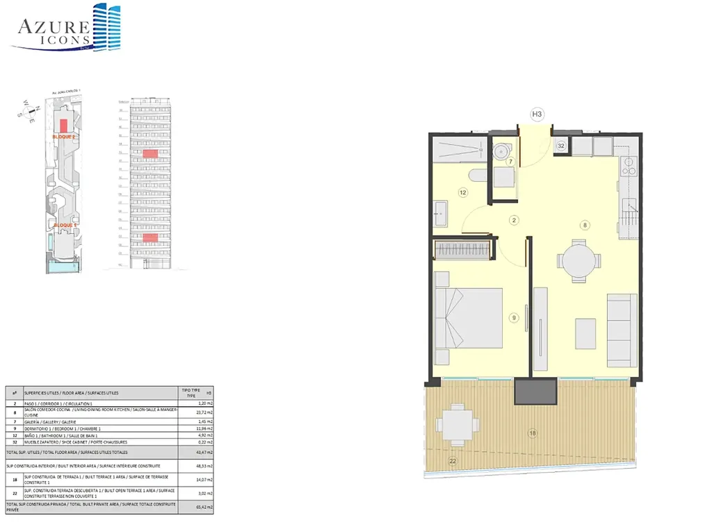 Nabízíme k prodeji moderní apartmán v exkluzivním rezidenčním projektu AZURE ICONS, který se nachází v letovisku Calpe na pobřeží Costa Blanca. Projekt leží v první linii u pláže La Fossa, jen pár kroků od moře, s přímými pěšími vstupy jak z Avenida Juan Carlos I, tak z pobřežní promenády.