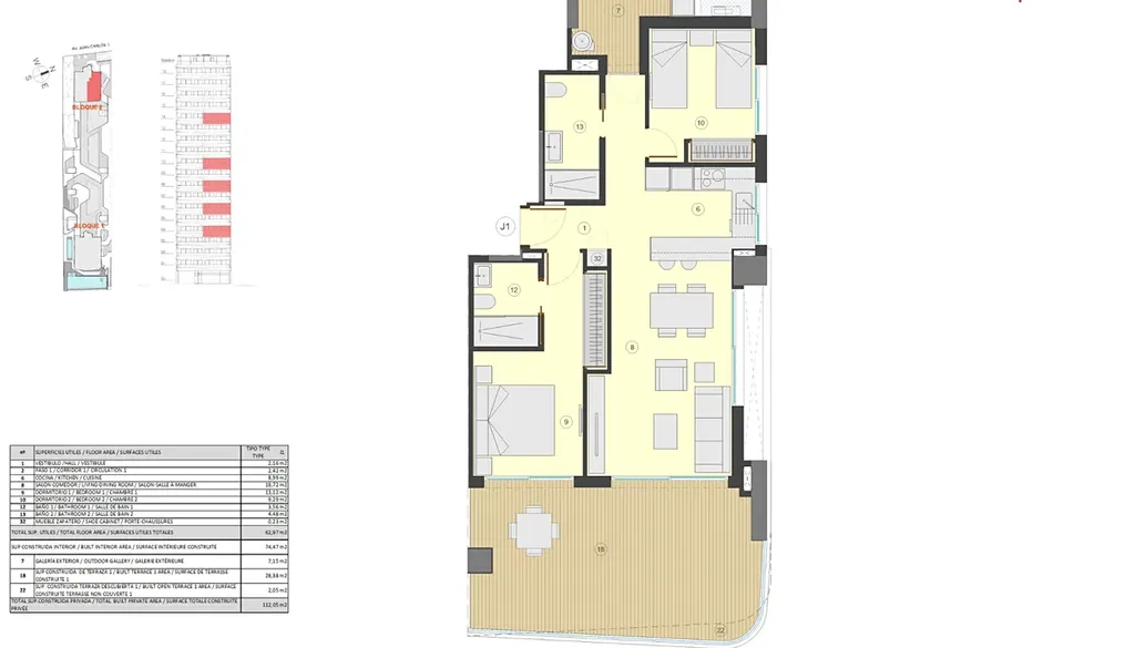 Byt je situován v 8. podlaží a nabízí praktickou dispozici se dvěma ložnicemi. Celková podlahová plocha činí 82 m² a je doplněna prostornou terasou o velikosti 30 m², ideální pro relaxaci i posezení s výhledem. Díky jihovýchodní orientaci je byt příjemně prosvětlený a nabízí dostatek přirozeného světla po celý den. Cena této jednotky činí 633 000 €.